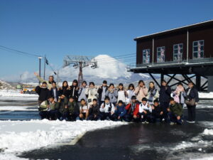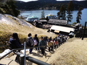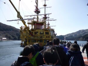 1年生が宿泊している箱根は、夜中に雪が降り、朝起きて外を見ると昨日とは違う景色が広がっていました。快晴の二日目は、まずホテルからバスで大涌谷へ。迫力ある火山活動の様子や雪化粧をまとった富士山を間近に見ることができました。それからロープウェイで桃源台駅へ。芦ノ湖では海賊船に乗り、箱根の壮大な自然を肌で感じました。昼食後は箱根関所に行って貴重な資料や展示などから当時の様子を学び、歴史の学習を深めました。一泊二日という短い期間でしたが、学年の仲間と寝食をともにする中で自立心と協調性が育まれ、出発時よりも少しだけ大人になったと感じます。