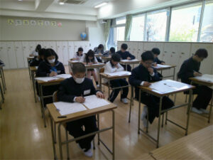 AB組は英語と数学のグループ編成テストを行いました。入学してから初めてのテストに、気合が入っていたり、緊張感を持っていたりと様々な様子が見られました。明日からは、いよいよ各教科の授業が始まります。それぞれの教科で新たな発見やおもしろさを見つけ、知識を深めていってほしいと思います。