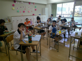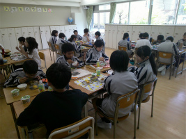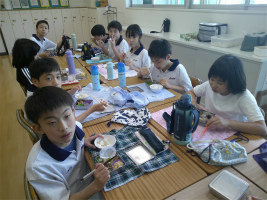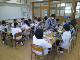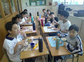 本校の給食は、バラエティー豊富なメニューを提供していることもあり、給食を楽しみにしている生徒も多くいます。席を向かい合わせ、みんなで食事をすると、自然と会話も弾み、笑顔があふれる時間となります。入学から1週間が経ち、生徒の表情は和らいできました。給食はクラスメイトと仲を深める良い機会となっています。