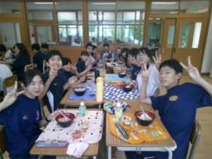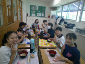 本日はA~E組の混合班で給食を食べました。入学から早2か月が経ち、中学校生活や新しい友だちにも慣れてきたところで、会話も弾んでいる様子でした。清掃など日々の学校生活でクラスを越えた学年の関わりをこれからも深めていきます。