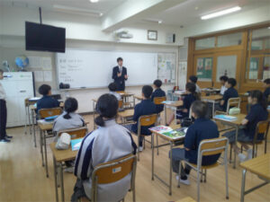 英語の授業では、スピーキング力をはかる場として、学期ごとに全学年それぞれスピーチを行っています。今回が初めてとなる1年生は、「自分のことを伝えよう」というテーマでスピーチをしました。自分の好きなこと等について、練習の成果を発揮しクラス全員の前で堂々と話すことができました。ALTのアレックス先生からも”You all did very well!”とコメントをもらい、自信につながった様子です。