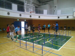 天候が不安定だったため、体育館での練習となりましたが、本校陸上競技部顧問より速く走るための秘訣やトレーニング方法をレクチャーしました。