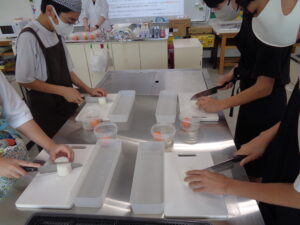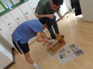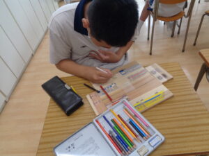 「体験・実習」は2コマ続きの授業で、実生活に必要なスキルを経験を通して学んでいきます。今日の実習は学年で「木工」と「調理」のクラスに分かれて行いました。木工はティッシュBOXを作っています。材料の木をサイズに合わせて切り、組み立てる前に好きな模様や絵を描きます。のこぎりの使い方は昨年も経験したせいかよく理解しており、力を入れすぎることなく切れていました。絵についても各自で好きなものを描いており楽しんでいるようで良かったです。調理は先週に続き大根のイチョウ切りと人参の半月切りを行いました。少しずつ薄く丁寧に切れるようになっていますが、両方ともイチョウ切りにしてしまった生徒も数名いて、一斉での説明をしっかり聞き取り理解することは今後も意識していけるとよいです。