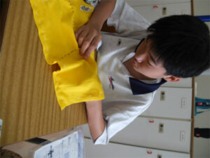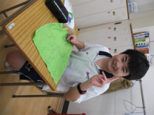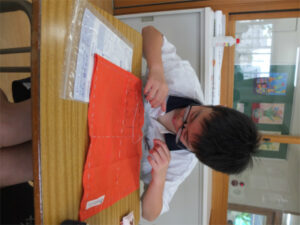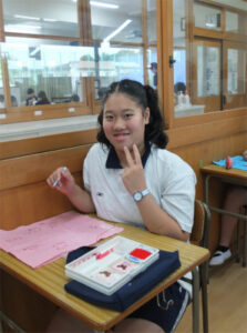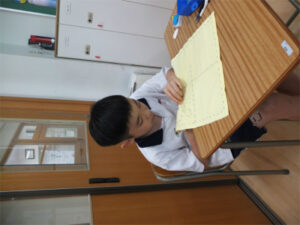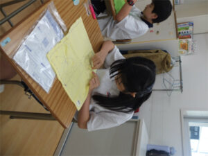 1学年では、被服の実習としてふきんの製作に取り組んでいます。針に糸を通す、玉結び、玉どめ、並縫いの基本技術の習得だけではなく、自分の好きな色の布や糸を選び、オリジナルの装飾を入れるなど、「自分らしさ」を盛り込むことにも挑戦しています。お気に入りの「自分だけのふきん」ができあがることが、今年度の重点である「豊かに生きる」ことにもつながります。ひと針、ひと針、その生徒自身がふきんの上に表現されてきました。できあがったふきんは、2学期の調理実習で使う予定になっています。