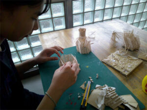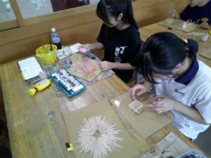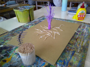 2学年AB組の美術では、抽象分野の作品に取り組んでいます。今年度は「こころのかたち」というテーマのもと、様々な感情の中からそれぞれがテーマを絞り創造していきます。今回使用する材料は段ボールと爪楊枝です。授業の回数を重ねる毎に、表現の可能性がどんどん広がり、生徒たちの豊かな感性によって少しずつかたちになってきました。10月の完成、そして学園祭での展示を目指していきます。