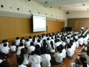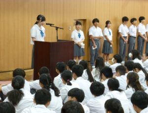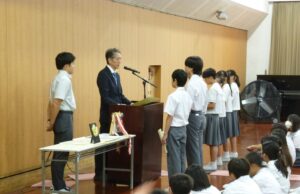 長い夏休みを終え、生徒たちは久しぶりに友だちと再会し、楽しそうな笑顔があふれていました。始業式では、校長先生から「1学期にしっかり固めた基礎を、2学期には大きく実らせていきましょう」というメッセージが伝えられました。また、各部活の部長から夏の活動についての報告をするとともに、関東大会や全国大会に出場した生徒たちの活躍を動画で視聴し、その頑張りを労いました。2学期も、それぞれの目標に向かって充実した日々を送ってくれることを期待しています。