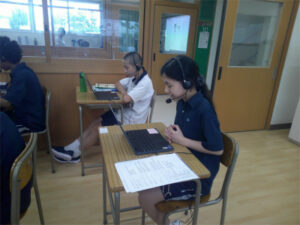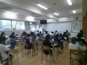 本校の英語教育は「使える英語」を目指して、日々の授業に取り組んでいます。2学期より1年生のオンライン英会話がスタートしました。週に1回Chromebookを使って海外の外国人講師とマンツーマンのレッスンを行い、英語を積極的にアウトプットすることが目標です。初めてのレッスンに緊張している様子もありましたが、25分のレッスンが終わると「楽しかった!」との感想や、「先生とどんな話をした?」とお互いにレッスンの内容を確認する様子も見られ、1学期の学習の手応えも感じることができた様子でした。