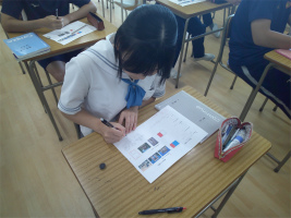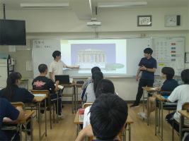 本校では、教科横断型授業(コラボ授業)を取り入れ、幅広い視野での学びをすすめています。今回は3年生で「黄金比と白銀比」をテーマに、数学と美術のコラボ授業を行いました。それぞれの比がどのような長方形から導かれるのか計算して理解した後、これらの比が美術作品の中でどのように活用されているのかを何点か実例をもとに学習しました。古代の建築物から現代のキャラクターデザインまで幅広い様々な例をみる中で、「こんなところにも使われているのか」「バランスの美しさには理由があるのか」と驚きの表情が見られ、視野が広がる良い機会となりました。