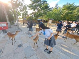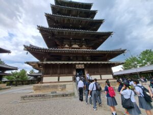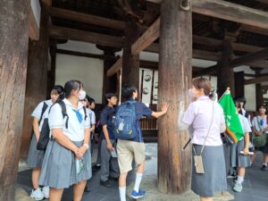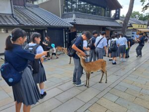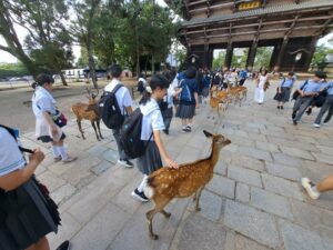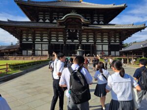 初日の今日は奈良へバスで移動し、法隆寺、興福寺・国宝館、奈良公園、東大寺を参拝。ガイドさんの説明や事前学習で学んだことを実際に自分の目で確認していました。東京ではなかなか触れ合えないシカがたくさんいることも新鮮だったようです。