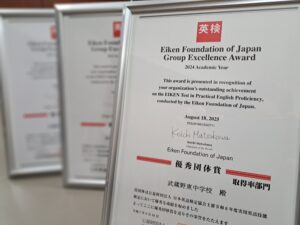 一昨年度、昨年度に引き続き、英検協会より「優秀団体賞」をいただきました。これは在校生徒数に対する英検取得者数が多い団体に与えられる賞で、本校は今回で通算6回目の授賞となります。2024年度は、中学3年生の92%が3級以上、さらに61%が準2級(高校中級程度)以上に合格するなど顕著な成績を収めました。