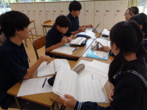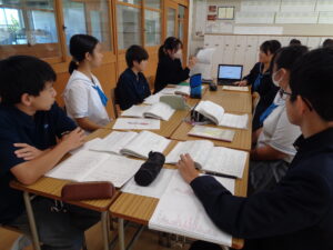 本校では、家庭での学習を自分で計画し実行する力を養うために「自主学習プランノート」というオリジナルのノートを活用しています。毎日担任の先生に提出し、アドバイスをもらっていますが、本日は生徒同士で学び合うプランノート研修会を行いました。今回は生徒会の1つであるアクティベーション(学校活性化)委員会の企画で縦割り班での研修となりました。普段から自分で工夫しているところを発表し、プランや目標の立て方、自己評価の仕方、具体的な学習方法などを共有し、実際にお互いのノートを見て学んでいます。熱心にメモを取る姿勢や後輩にアドバイスする様子があり、終了後には早速良いものを自分の学習プランに取り入れたいというコメントも多くありました。