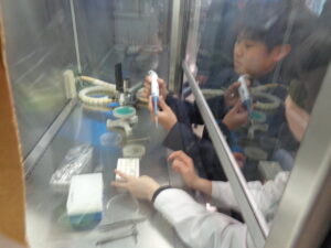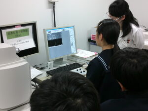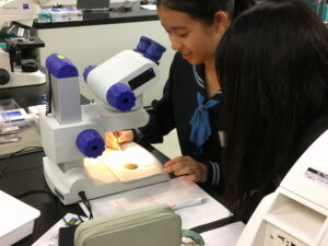 希望者対象の理科講座「サイエンスラボ」の企画として『植物の病原菌観察教室』を、法政大学の生命科学部応用植物科学科の実験室にて開催しました。担当の教授より植物の病原菌の研究が食糧問題でどのように生かされているか、また今後の問題点などの講義があり、その後学内の施設を見学しました。多種類の植物や菌が培養されている装置などの説明を受け、ナシとエノキの病原菌を光学顕微鏡と電子顕微鏡で観察しました。葉から病原菌を採取しプレパラートを作る作業に取り組む生徒たちの表情は真剣そのものです。菌を培養する作業では、ワサビやレモンなど身近な物から抽出した液をかけてどの程度菌の増殖が抑えられるかという作業も行い、後日担当の先生から結果を画像で送っていただくことになりました。植物の病気を抑えられるという発見につながるかもしれません。生徒たちが普段体験できない貴重な実験や観察ができ、大変有意義な時間になりました。