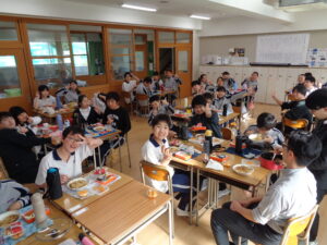 本日は1年CDE組が一つの教室に集まり一緒に給食を食べました。スポーツ大会や学園祭、2学期の大きな行事を乗り越え、仲を深めてきた1年生。準備も自分たちで積極的に行うことができました。自由席だったのでお互いに誘い合う様子もあり、和やかな時間となりました。