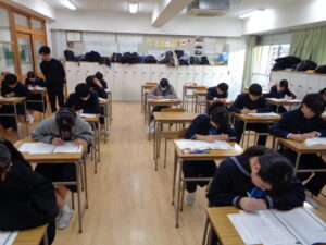 校内で実施する今年度最後の英検が行われました。冬休み明けには本校オリジナルの単語テスト(WIT)も行われ、積み重ねの学習を頑張ってきた生徒たち。最近の自主学習では英検合格に向けて語彙だけでなくライティング力、発展的な文法を習得しようと尽力する様子があり、生徒たちは確実に力をつけてきました。試験開始前は緊張した表情が見られましたが、開始後は落ち着いた態度で真剣に問題に励んでいました。