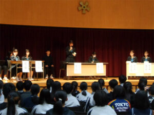 立候補した生徒は、自分の意見をしっかりと伝わるように述べるだけでなく、立候補者同士の意見をよく聞き、批判でなくお互いの意見がよりよく理解できるようなやりとりを繰り広げました。生徒達もその様子を集中して聴いており、投票に向けて考えを深める良い時間となりました。