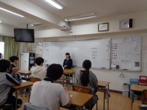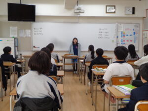 英語の授業では、「話す」力をはかる場として、学期末にスピーチテストを実施しています。今学期のテーマは1年生が“My memory of this year(今年の思い出)”、2年生は“The song I recommend(おすすめの曲紹介)”です。1年生は過去形を使いながら、2年生は現在完了形や受け身を使うなど、最近学習した文法を駆使して表現することができました。今後もコミュニケーションのツールとして使える英語を目標に英語力を伸ばしていきます。