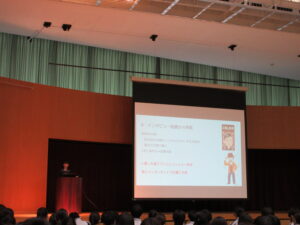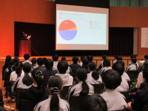 探究科の校内審査で優秀賞に選ばれた生徒4名によるプレゼンテーションが行われました。優秀賞に選ばれた作品は「【制服】デザインの変化とこれからの制服」「赤ずきんの結末はなぜ変わったのか~恐怖から自立へ社会的価値観の変容~」「高齢者とQuality of Life~高齢者向けのファッションビジネスはどのように行っていったらよいか~」「農業の温暖化問題~青パパイヤを中野で育てる~」の4点です。どの作品も個人的な興味、関心を出発点にしながら、社会的な視点へと広げられている点が素晴らしく、先行研究を踏まえて、アンケート調査を行ったり、実際に制作活動に取り組んだりと、どれもオリジナリティに富んだ作品ばかりでした。これから本格的に個人探究に入る1年生にとっては大変有意義な学びの機会となりました。
