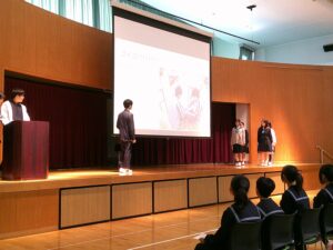 顔合わせ会では、1日の生活の流れや行事、委員会について、新入生に楽しみながら知ってもらおうと2・3年生がこの日のために準備を行い、寸劇を交えた説明や紹介を行いました。はじめは緊張していた1年生も、先輩方の温かく明るい雰囲気の中、楽しみながら学校生活について知ることができました。