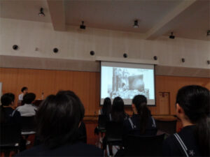 3年生は5月に修学学習で長崎を訪れます。生命科ではこれまで“平和”という単元の中で、広島と長崎に投下された原爆について映像等を通して学んできましたが、今回はより学びを深めるため、外部講師をお招きして被爆者の体験を伝え聞く機会を設けました。講演の中では、被爆された方の身内の方が描かれたという挿絵とともに、当時の様子をお話いただき、被爆者の痛切な思いを感じることができました。現在も世界では戦争がおきているという現実にも目をむけ、他人事ではなく、小さなことでも自分たちができることは何か、を考える時間にもなりました。