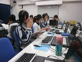 2学期から1年生のオンライン英会話が始まっています。初回はやや緊張した面持ちでしたが、すでにだいぶ慣れ、テキストをもとに、笑顔で画面の向こうの講師と話しています。中には身振り手振りを交えて伝えようトスと生徒もいます。次回が楽しみになるような、英会話が進んでいます。