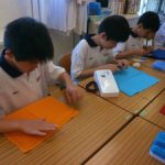 2学期第1回目の被服実習を行いました。2学期からは、1学期に学んだ玉止めや玉結び、並縫いの技術を生かして、ふきんを製作していきます。今回は4辺の並縫いをそれぞれのペースで進めました。チャコペンでの印の上に点線を加えるなどの工夫も行い、丁寧に縫い進めることを目標に、完成を目指していきます。