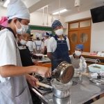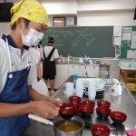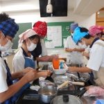 今日の調理実習では、「出汁の取り方」を学ぶとともに、美味しさの元となっている「旨味」を味わいました。出汁は、「かつお出汁」と「煮干し出汁」の2種類です。沸騰したお湯にかつお節を入れ、濾すと黄金色の出汁ができます。煮干し出汁の方は、煮干しの頭と肝を取り除き水から火にかけます。できあがったものは、かつお出汁に比べると透明に近い色でした。それぞれの出汁の色、香り、そして味を大さじ1杯分ずつ試飲。同時に、味噌を溶いただけのお湯も試飲。その後、今度はそれぞれの出汁に味噌を溶き入れたものを飲んで比べてみます。味噌だけの時と出汁に味噌を加えたものとの差は歴然としていて、「美味しい!」の声があがりました。出汁の効果を実感した瞬間でした。次回以降、味噌汁や豚汁の作り方を学んでいきます。
