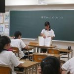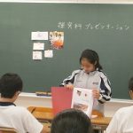 2年生の「探究科」では、ガイダンス、テーマ設定、グループ報告会を経て、各自が探究した事柄を発表するプレゼンテーションのステージへ入っています。発表を聞く側の生徒たちも、発想力、内容、構成・表現力などの観点から評価をします。このような活動を通して、訴求力や批評力が身についていきます。
