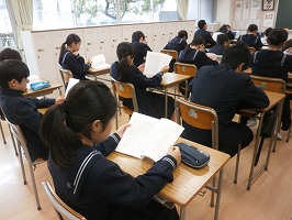 東学園が以前、中学生向けに作成した小冊子「学園創立の母-北原キヨ先生の歩んだ道」を全員で熟読しました。10ページ程度の短い文章ですが、幼少のエピソードや幼稚園創立に至るまでの経過が簡潔にまとめられています。生徒たちは創立当時の苦労や喜びを垣間見ることもできたようで、学園祭を前に創立者の考えを改めて認識するよい機会となりました。