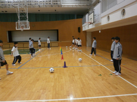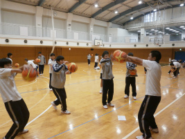スポーツ大会後の体育では、AB組がバスケットボール、CDE組がサッカーを行っています。バスケットボールではスムーズなレイアップシュートが出来ることを目標に、サッカーでは、インサイドキックでのパスやドリブルシュートの習得を目標としています。AB組の授業では、日替わりのリーダーが班をまとめ練習を進めます。また、CDE組も体育係が行う準備体操を交代して行う時があります。多くの生徒が小集団でのリーダーとなる機会を作り、スモールステップを踏んでいく中で、クラスや学年、更には学校を引っぱるリーダーに成長して欲しいです。