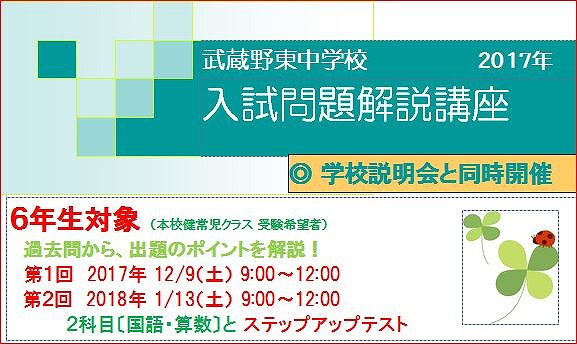 12月9日(土)に学校説明会と同時開催で、第1回6年生対象「入問題解説講座」(9:00~12:00)を実施します。本校で過去に出題された国語と算数の入試問題から出題のポイントを解説します。またその後、国語と算数の「ステップアップテスト(計60分」で実力試しが出来ます(答案は後日返却します)。お申し込みは12月7日(木)まで、本校ホームページからお申し込みください。また、同時開催の学校説明会も行われますがこちらへの参加も希望される方は、別途にお申し込みが必要となります。皆様のご来校をお待ちしています。