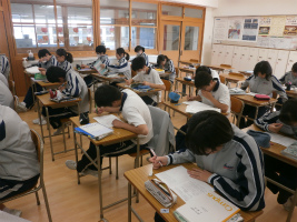 3年生の理科は今、入試演習を中心に授業を行っています。理科は物理・化学・生物・地学と4分野に分かれますが、各分野のポイントとなる単元に的を絞り演習を繰り返しているところです。生徒達は分野ごとの難易度の違い、計算や記述、得意・不得意の差を克服しようと取り組んでいます。また授業をきっかけに、自分なりの課題を見つけ自主学習へと生かしており、受験に向けた意気込みを感じます。