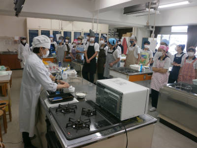 実習は2時間続きの授業で、社会自立を視野に入れ実生活に必要な内容を学年ごとに行います。3学期の最初の授業は調理分野を取扱い、今回は手軽にできる調理パンを作りました。技術家庭科の教諭より作り方の説明を受けた後にグループごとに分かれて作業を進めます。計量カップやスプーンなどの調理器具で正確に材料を量った後、パン生地を作りました。その際、電子レンジやオーブンの使い方も学習しました。また、今回使用した強力粉が小麦粉の中でタンパク質の含有量の割合が高い硬質小麦としてパン生地に適していることも確認しています。