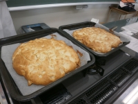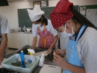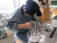 2年生最後の調理実習は「お菓子作り」。ポイントは「計量」で、キッチンスケール、計量カップ、大さじを使って材料を正確に量る練習をしました。袋から容器に移す際にこぼさないようにすることも心がけています。今回作ったのは、パン粉のクッキーとリンゴのケーキです。材料をボウルに混ぜていく順番や、混ぜ方、混ぜる際の道具の使い分け、生地の固さ、成型等、事前の指示をよく聞いて作業を進めていくことも重要でした。リンゴは、8等分したものを包丁を使って皮をむきました。まだまだぎこちないところもありますが、家庭で練習してきた生徒も多く、一生懸命取り組んでいました。洗い物や調理台の片づけは、協力して手際よくできるようになっています。焼き上がったお菓子はみんなで美味しくいただきました。1年間の調理実習を通して様々な料理の作り方を学んだだけでなく、事前や事後に家庭でも練習を繰り返すことで技術が向上しています。今年度の積み重ねを元に、今後もスキルアップを目指していきます。