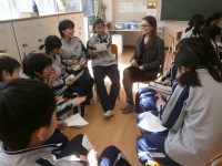本日1年生AB組では、来日しているボストン東スクールの先生方との交流授業を行いました。グループに1人の先生を交え自己紹介をした後、英語で質問をして会話を楽しみました。先生自身に関することやボストンのことなど様々な質問をすることができ、生徒は返ってくる英語の答えに熱心に耳を傾けていました。また話題は日本の文化にも及び、生徒は身近な日本文化について、語彙を駆使して説明する様子も見られました。今年度から中学校ではオンライン英会話を導入しており、その経験も今日の授業では生かされていたと思います。ネイティブスピーカーの英語に触れる貴重な時間を、充実して過ごすことができました。