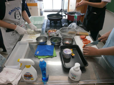 実習は2時間続きの授業で、社会自立を視野に入れ実生活に必要な内容を学年ごとに行います。今回は3クラス合同で調理実習を行いました。調理の手順の説明を受けた後、6つのグループ(1グループ5~6名)に分かれて作業を進めます。調理器具や具材などを準備し、今回はトマトとツナのスパゲッティを作りました。どのグループも各自の役割を手際よく進めています。トマトや玉葱をカットしてから、ツナとともにソテーし、スパゲッティの麺のゆで方も確認しています。今後はレシピを元に家庭でも調理に取り組んでもらいたいと思います。