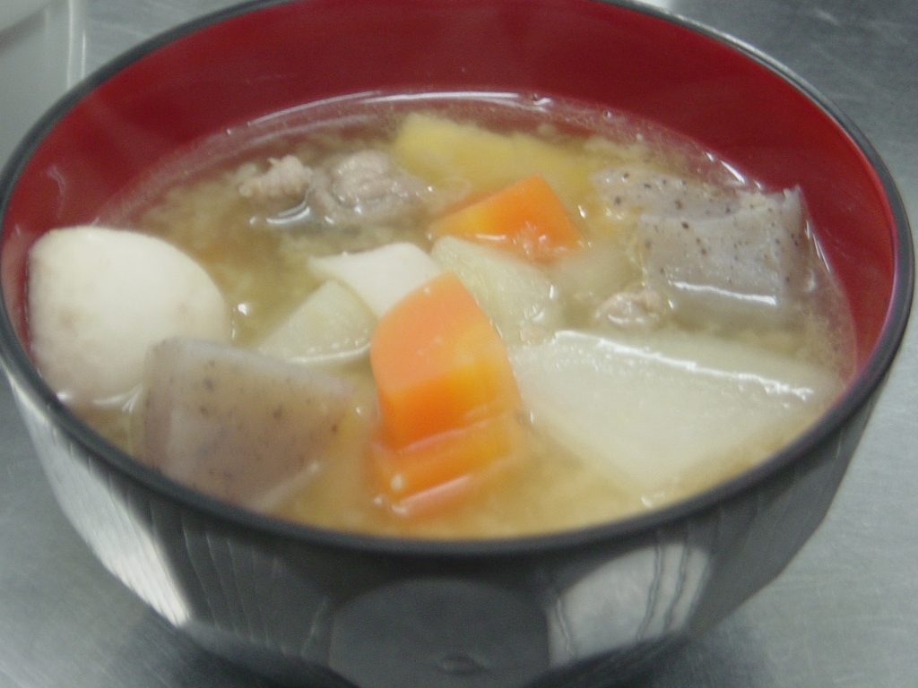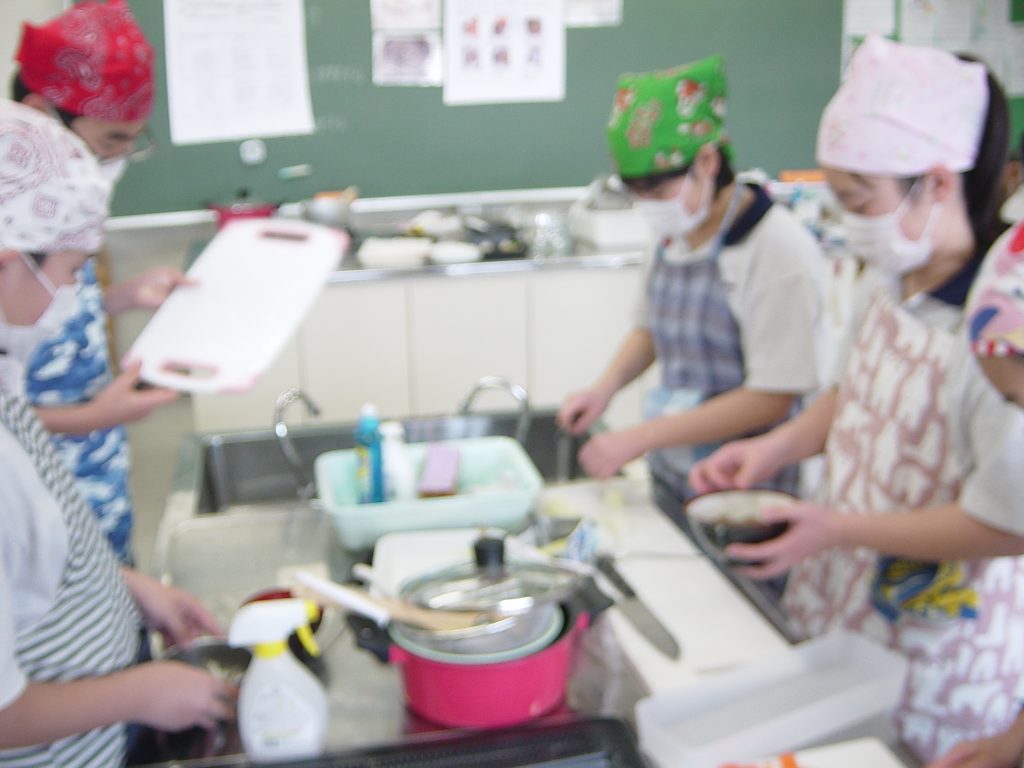 様々な食材の扱いや切り方を学べる豚汁を作りました。煮干しは頭と内臓をとってから出汁をとり、大根・にんじんはいちょう切り、ごぼうはささがきにして水にさらします。5人ほどの班で分担して調理を進めますが、野菜は誰が持ってきて、切ったらどこに置くのか等、細かい作業で戸惑う場面も見られました。互いに声を掛け合い、完成目標時間に仕上げ、ゆっくり試食することができました。レシピでは味噌の量を控えめにしていますが、素材や出汁の味を感じることもできたようです。普段食事を作ってくれる家族の手際の良さに気付き、改めて感謝と尊敬を感じた生徒も多くいました。