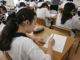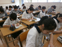 本校独自の教科、『生命科』は「自分の存在の重さを知り、他の人の重さを感じることができる」生徒になることを目標にしています。第一回の今日は、この目標に向け一年間をかけてどのように『生命科』を学んでいくのかを確認しました。また生徒手帳にある創立者、北原キヨの「生徒の皆さんに贈ることば」から、武蔵野東中学校の校訓をより深く読み込んでいます。生徒たちは一人ひとりが理想の姿を目指し、これからへの決意を込めて校訓を書き写したところです。