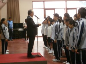 全校朝礼に先立ち、前期友愛会の任命式が行われました。任命されたのは各クラス役員と、各委員会の委員長・副委員長・書記の計58名です。3年生のクラス役員が代表として校長より任命証を受けた後、全校生徒の前で抱負を述べました。本日より新たな気持ちで、諸活動において主体的に活躍してくれることを期待しています。