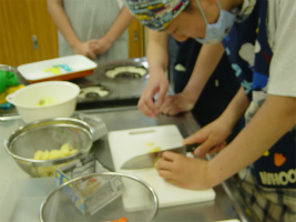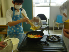 実習では、「調理」「木工」「被服」の3つの分野に分けてカリキュラムを組み、作業技術の向上を図っています。今日は調理実習で野菜を半月切りやイチョウ切りにする作業を行いました。包丁は1年生の時から使っていますが、今日は持ち方や力の入れ方などの基本を再度確認しています。切った野菜は炒めて美味しく頂きました。