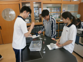イオンの学習もいよいよ最後の章です。小学校で学習した、酸とアルカリの原因となるイオンは何なのか。「電気泳動」という方法を使って確かめました。実験結果の予想を考える段階で、それぞれの原因となるイオンに気づいた生徒が多く見られ、実験結果から自分たちの予想が正しかったことが証明されました。このように予想を立てることと結果からの考察を大切にして、授業を進めています。