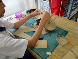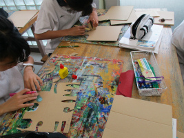 2年生AB組の美術では、段ボールを素材とした立体作品に取り組んでいます。0時から24時までの好きな時間帯を選び、その時間帯から連想する自身のイメージを形にしていきます。素材のおもしろさを見つけながら、各々の表現を試して制作を進めています。