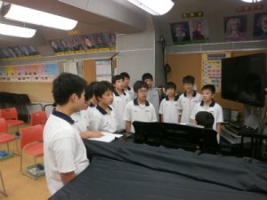 球技大会に続いて、いまは合唱コンクールに向けてクラスごとに練習を行っています。1年生にとってはすべての行事が初めてのことです。手探りをしながら、またときには担任からアドバイスを受けながらも意欲的に取り組んでいます。最近では、通しで歌った後に指揮者や伴奏者から注意点が伝えられるなど、徐々に練習スタイルが確立されてきました。