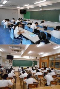今年度の第1回目の計算コンテストが行われました。 計算コンテストは年に3回実施し、1~3年生が同じ問題50題を15分で解き、その得点を競います。 今回の範囲は1年生の学習進度に合わせて文字式の計算までとしました。1年生にとっては、授業で学んだばかりの単元も含まれるために難しく感じる部分がありつつも、総合テストに向けて各自の計算力を確かめる良い機会になったようです。また、2・3年生は日々の授業で培った基礎計算力をよく発揮した結果となりました。(数学科)