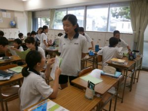 本校の英語の授業では音読活動に力を入れています。教科書の各レッスンでは、正しい発音で本文を読むReading Test、日本語を口頭で英語に訳すSpeaking Test、そして最後に本文を全て書くWriting Testの3つの小テストを行っています。苺(1語)読み、交互読み、ペア競争、スラッシュリーディングなど様々な音読方法があり、生徒たちはゲーム感覚で意欲的に取り組んでいます。正しい発音で速読することがリスニング力アップにも繋がり、英検でその力を実感している生徒も多くいるようです。