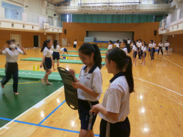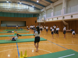 1年生はマット運動の基本技8種目を練習した後、本時は自分で4種目を選び自由に演技構成して発表する為の練習を行いました。それぞれ得意な種目を選び、友達からのアドバイスを受けながら構成を作っていました。また自分の演技を友達にiPadで撮影してもらい、自分の演技の流れや姿勢を確認していました。
