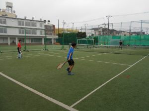 <硬式テニス>ラケットの基本的な使い方を学んだ後、フォアやバックのストローク練習をしました。更に、簡単なゲームにも挑戦しました。