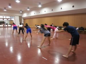 <ダンス>ステップ中心のバリエーションと中学校ダンス部作品「Rising」の振りうつしを行い、グループごと発表しました。