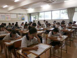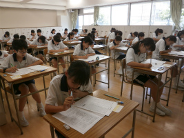 1・2年次は学期に1回、業者の模擬試験を行っています。今日は1年生にとってはじめての模試。今回は小学生で習った範囲も入っていて、実力を計るいい機会になっています。先日の総合テストの分析も進めて、この夏の学習課題を明確にしていきます。