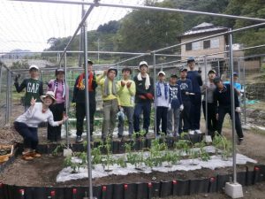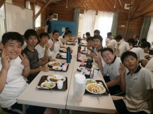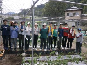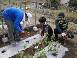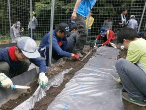今日は、今回のチロル学園合宿のメインイベントである農業従事活動を行いました。午前中、畑では昨日に引き続き土の中の小石をふるいにかけた後、土を耕して畝を完成させました。畑周辺での草取りは、昨日よりも手際良く進められたようでした。昼食は皆が大好きなカレーライス。おかわりをした人がとても多かったです。お腹いっぱいになった後は、いよいよ苗植え!畝にマルチシートをかぶせる作業、その周りに土を固める作業などをした後、トマト、カボチャ、マクワウリの苗を植えました。日常生活では体験できない畑での仕事を、皆で協力して行うことができ、大きな達成感を得られたことでしょう。