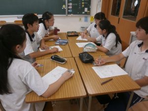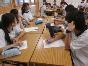 2年生の生命科では、「福祉」をテーマに学習をしています。本時は、そのまとめとして「自分たちが今できるボランティア活動は何か?」をテーマに意見を出し合いました。その中で、学年や班単位で実際の活動計画を具体的に立ててみました。中には、ボランティアの経験を多く積んでいる生徒もおり、注意点を細かくあげていました。今後もボランティアの重要性について理解を深めていきます。
